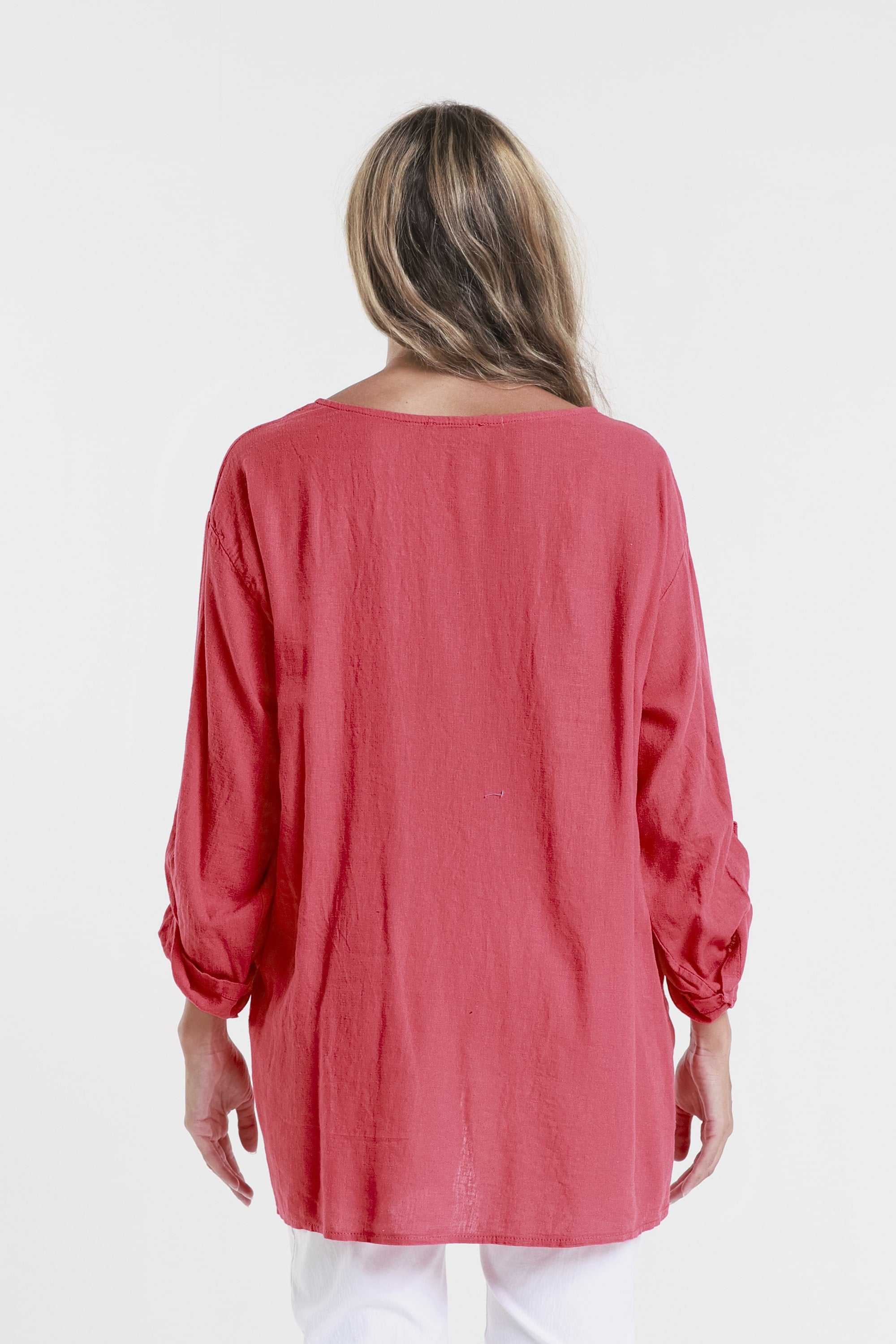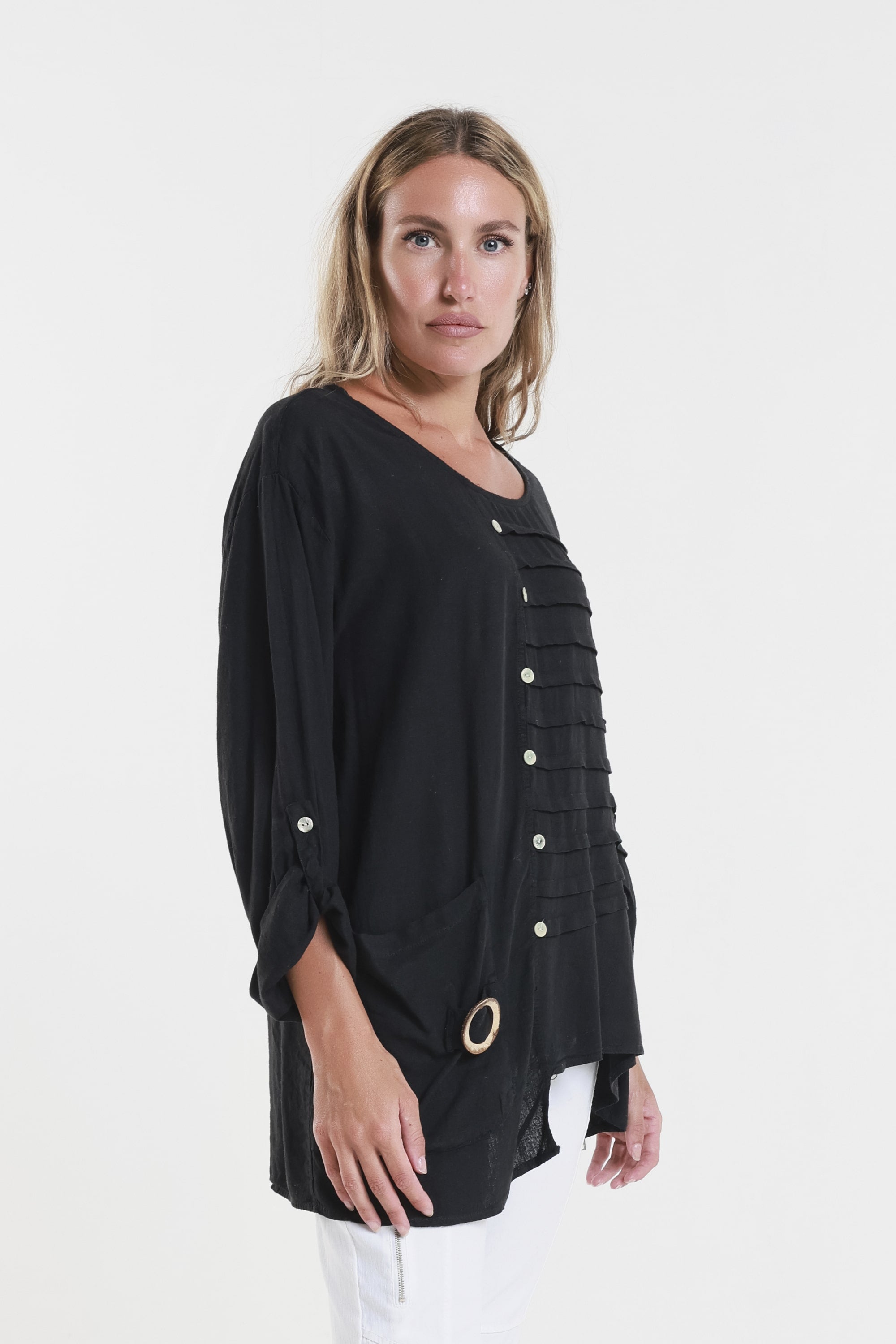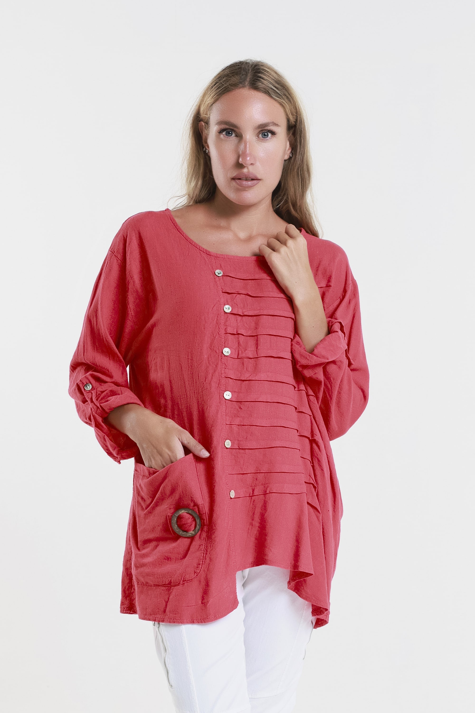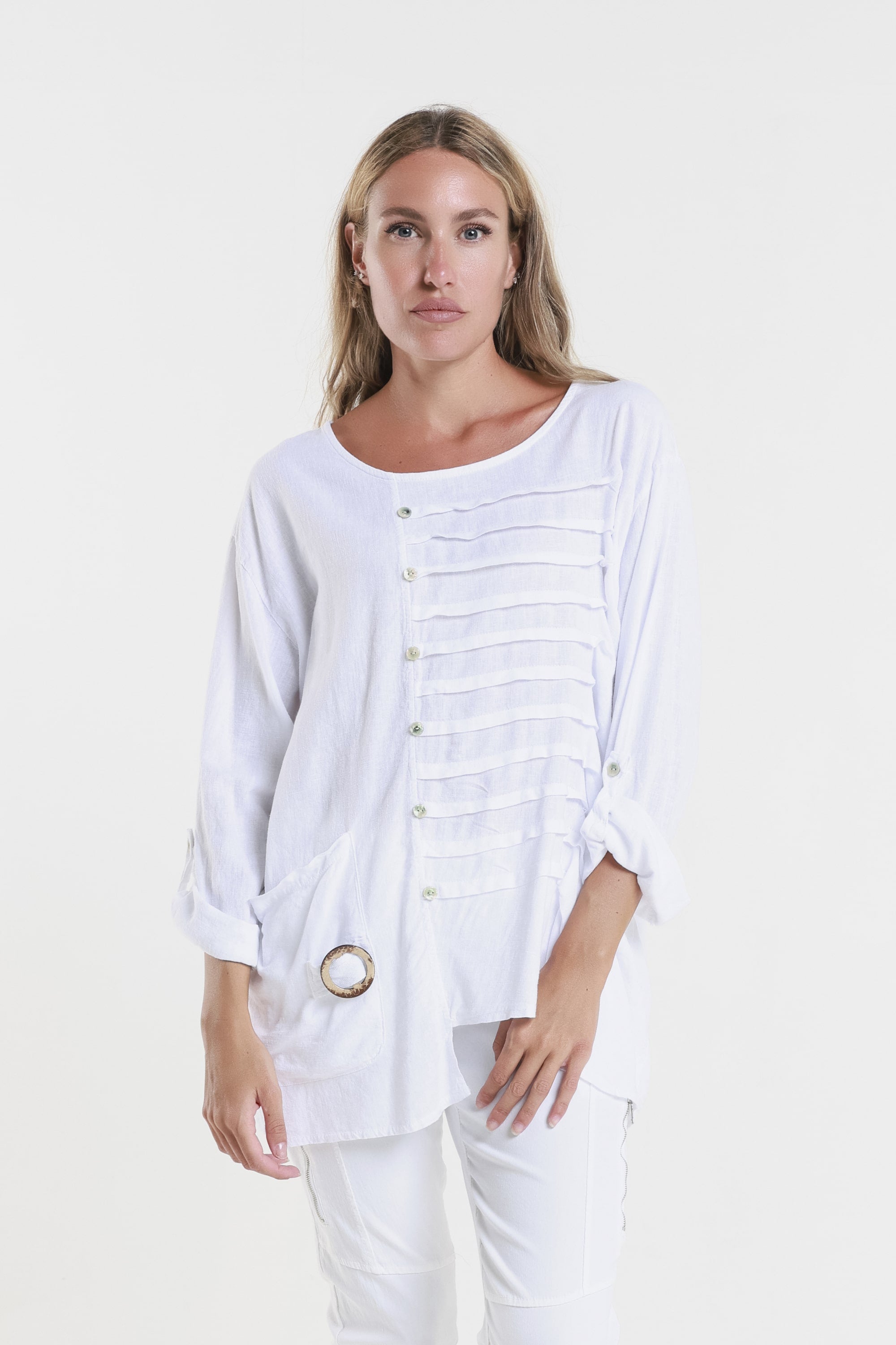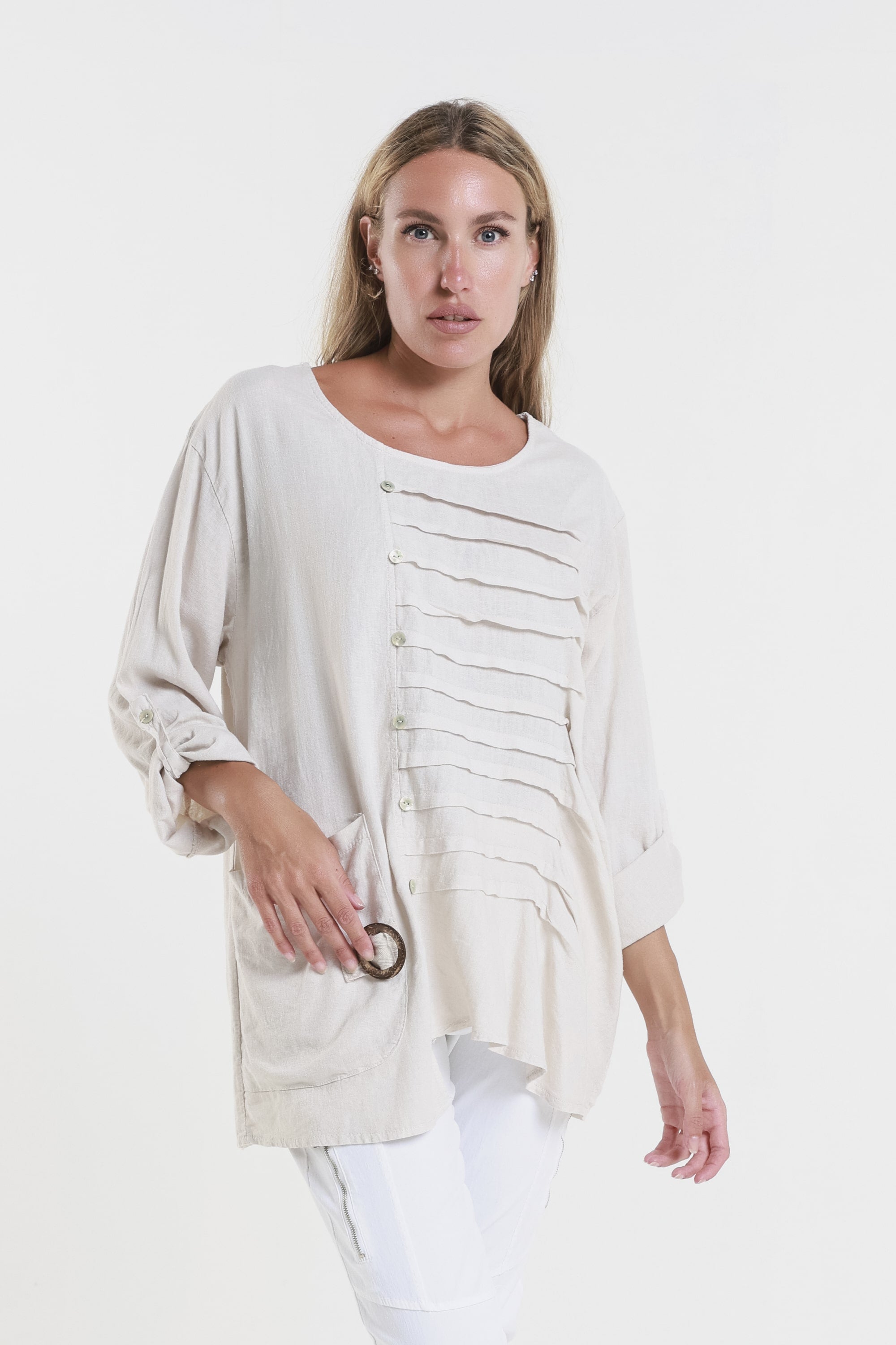 A twist on effortless dressing! Charlene is a 3/4 sleeve linen top that features an asymmetric pleat and pocket detail for subtle intrigue. Finished with a buttoned center seam and convertible cuffs, it is a versatile staple with understated charm. Made in Italy.
