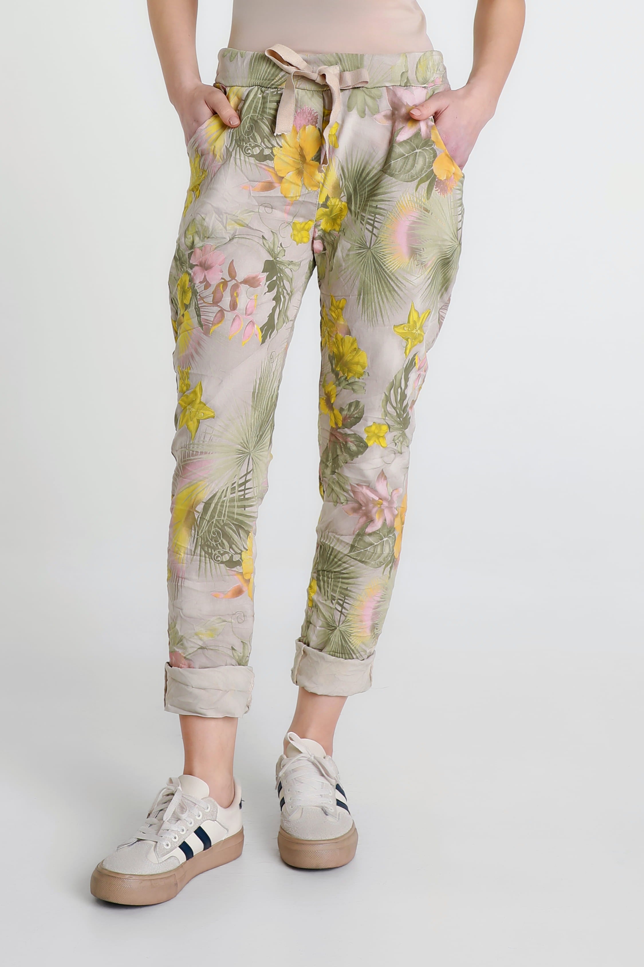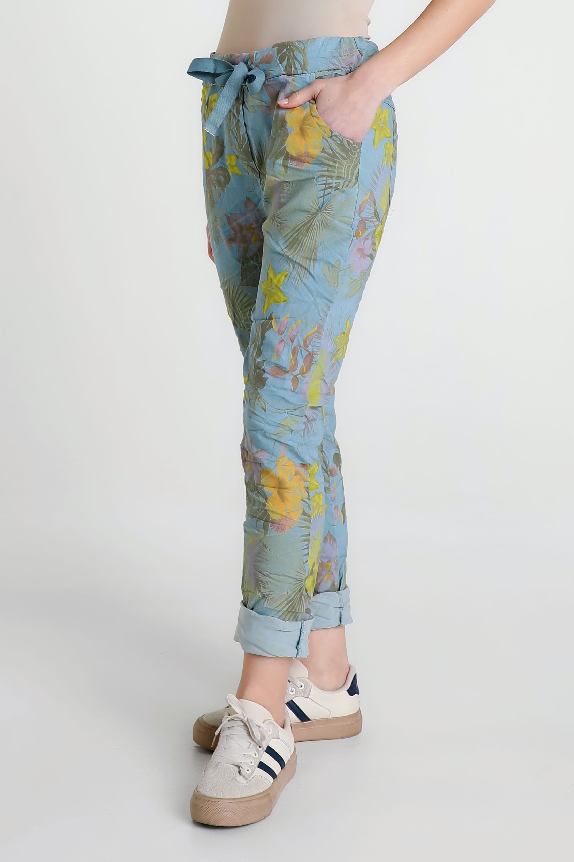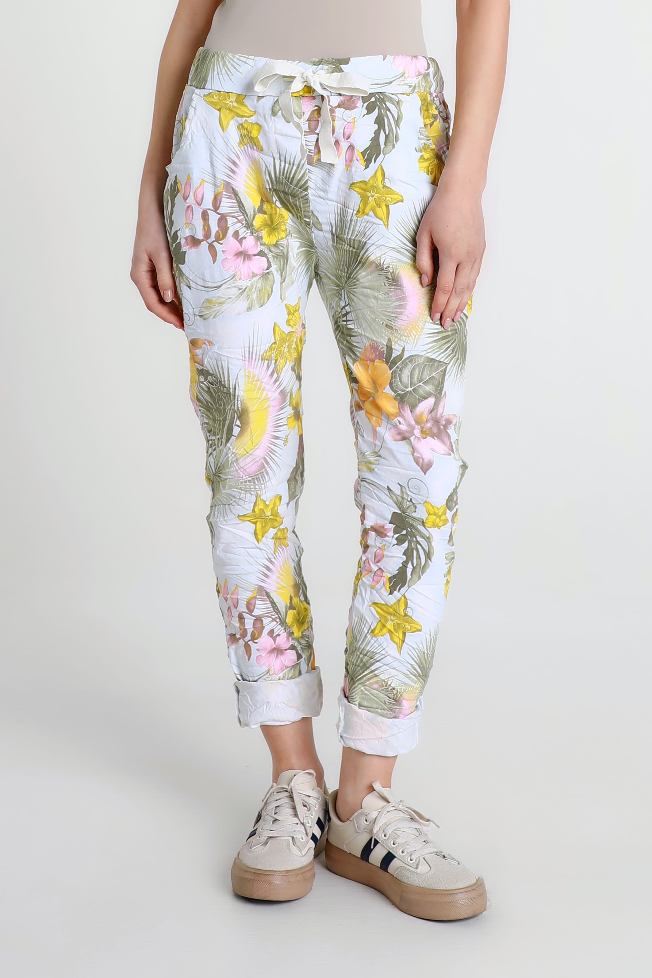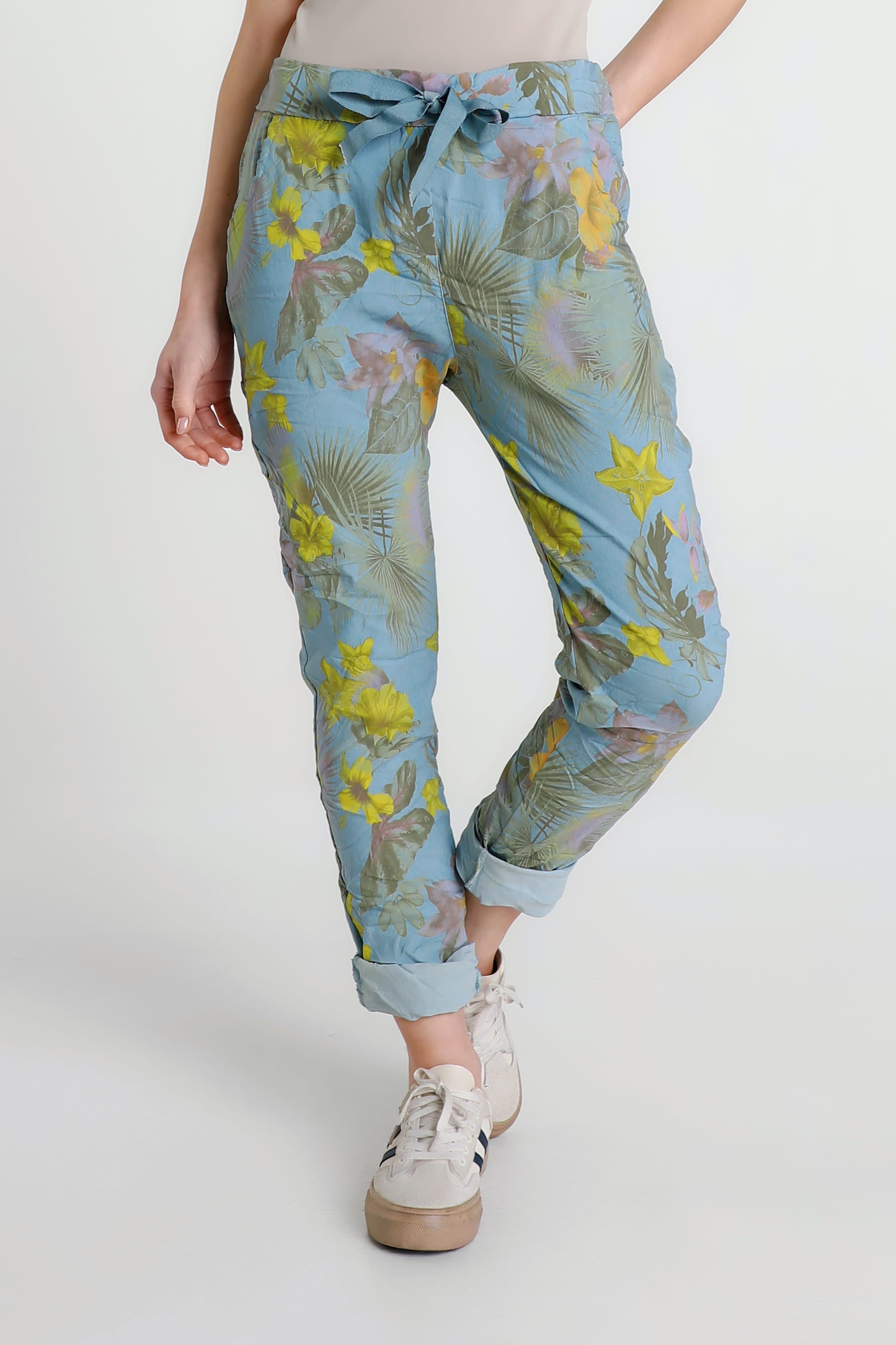 A gorgeous Starfruit print is featured on one of the comfiest pants you will ever own! The stretch Viscose fabric feels amazing all day and the adjustable tie adds a pretty bow detail, or tuck it in for a sleek finish. Pair her with your favorite Tee and fashion sneakers for an adorable weekend look. Made in Italy.