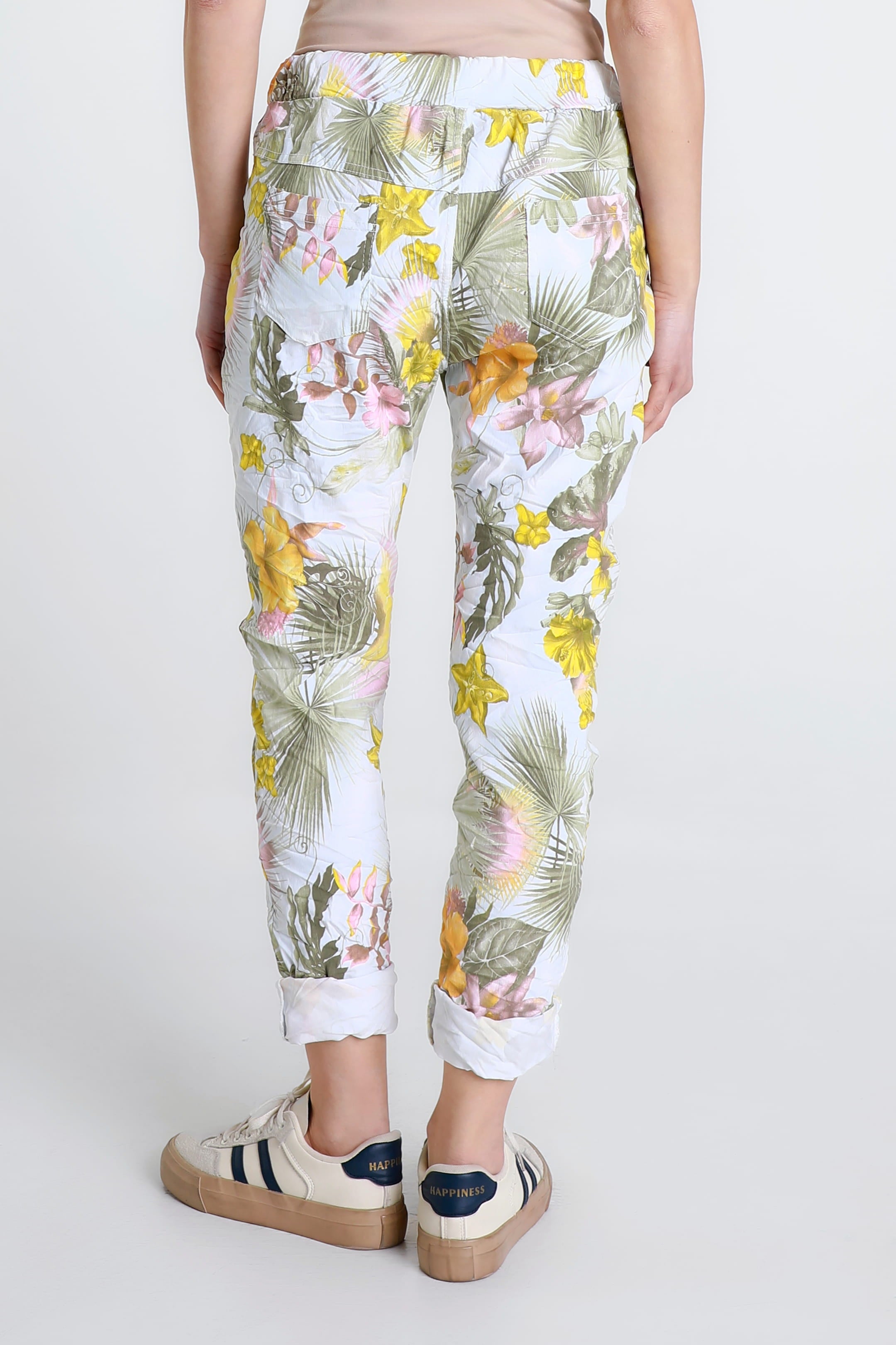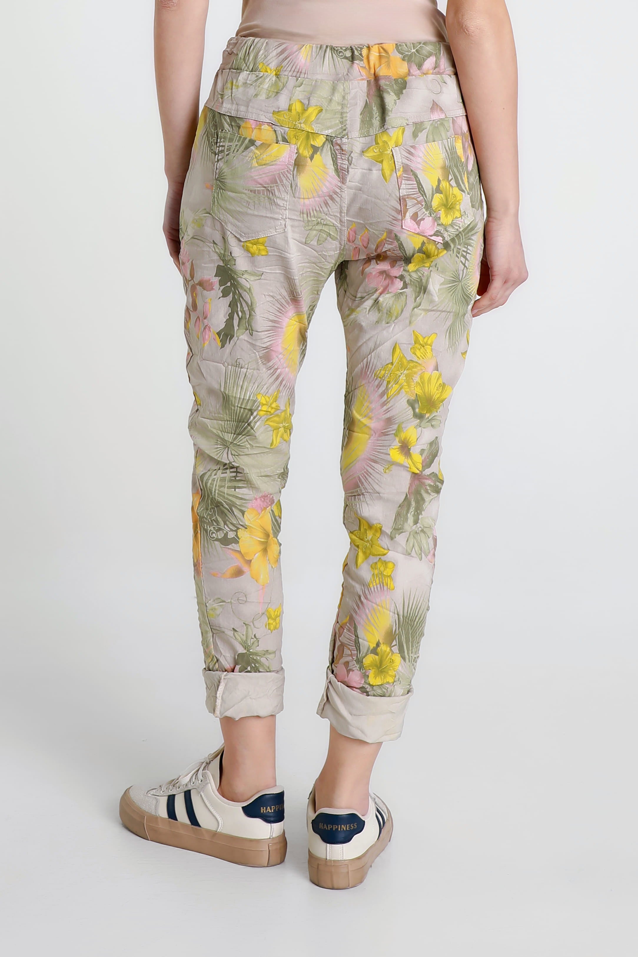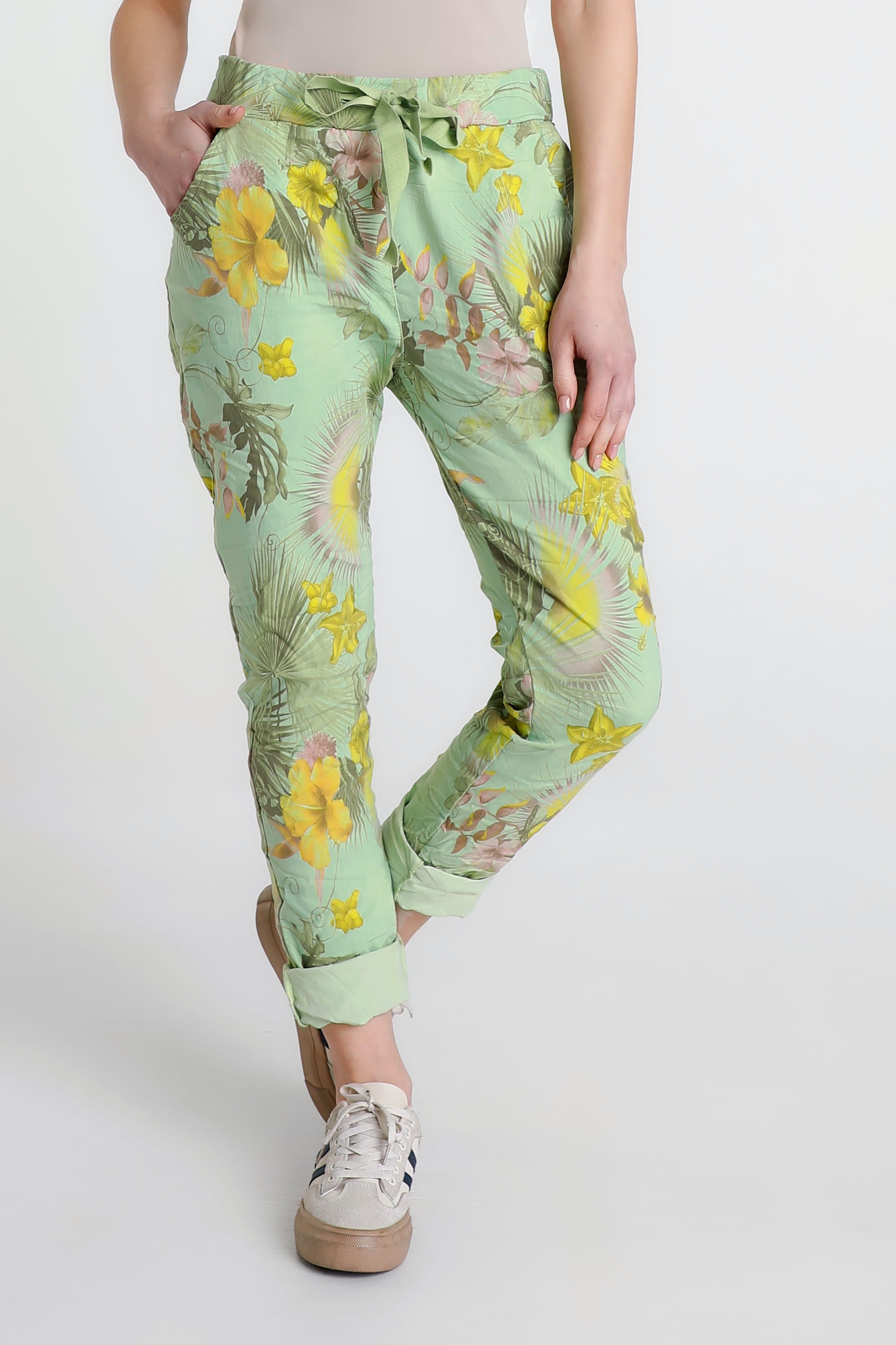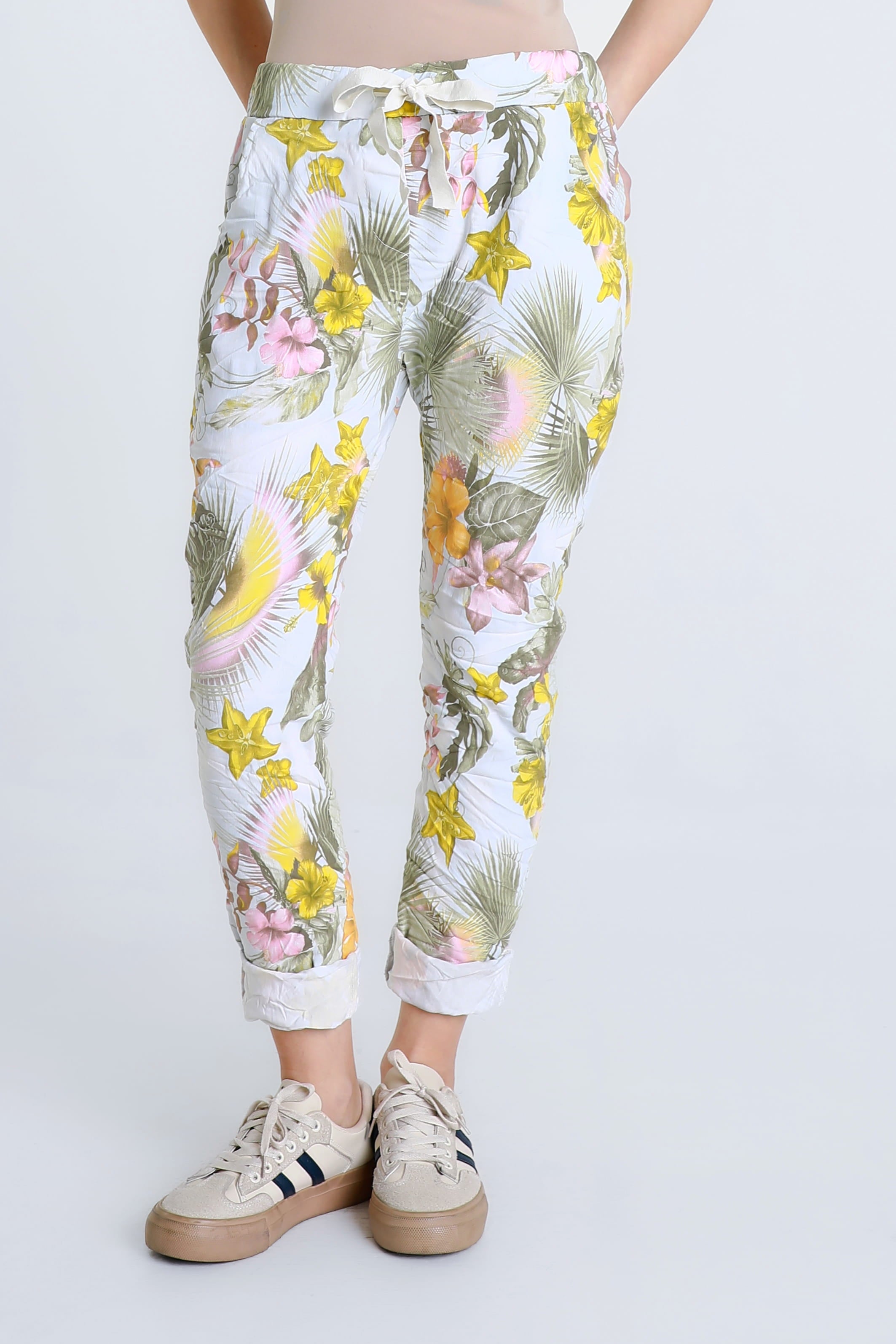 A gorgeous Starfruit print is featured on one of the comfiest pants you will ever own! The stretch Viscose fabric feels amazing all day and the adjustable tie adds a pretty bow detail, or tuck it in for a sleek finish. Pair her with your favorite Tee and fashion sneakers for an adorable weekend look. Made in Italy.