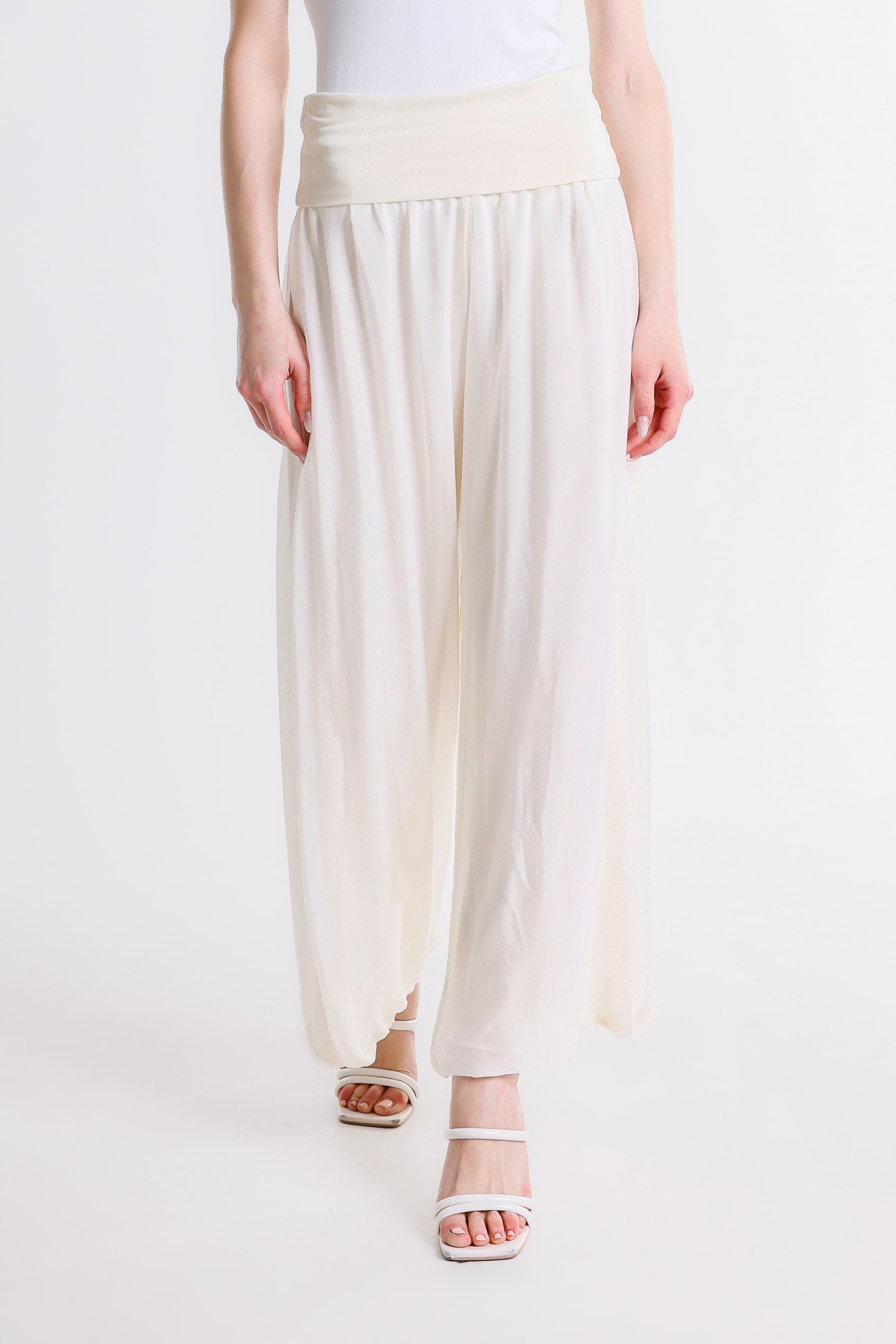 Simple elegance is exactly what you will get with this silky pull on pant. Washable silk overlay drapes effortlessly, while the buttery Viscose lining gives you coverage. This wide-leg trouser is a perfect pairing with any of our silk blouses. The waistband allows you to leave it up for a flawlessly smooth line, or fold down and wear lower on the hip if you wish. Made in Italy.