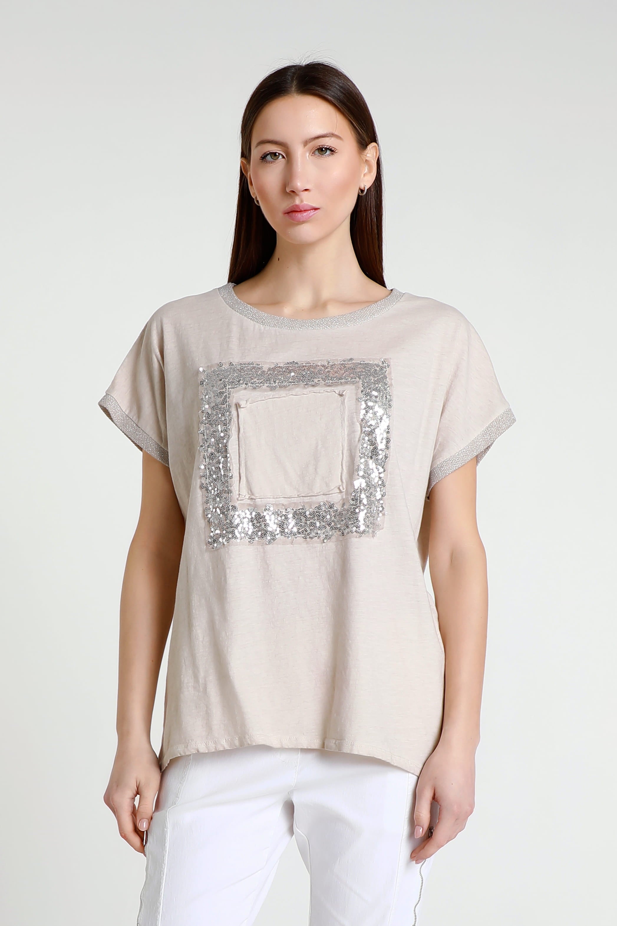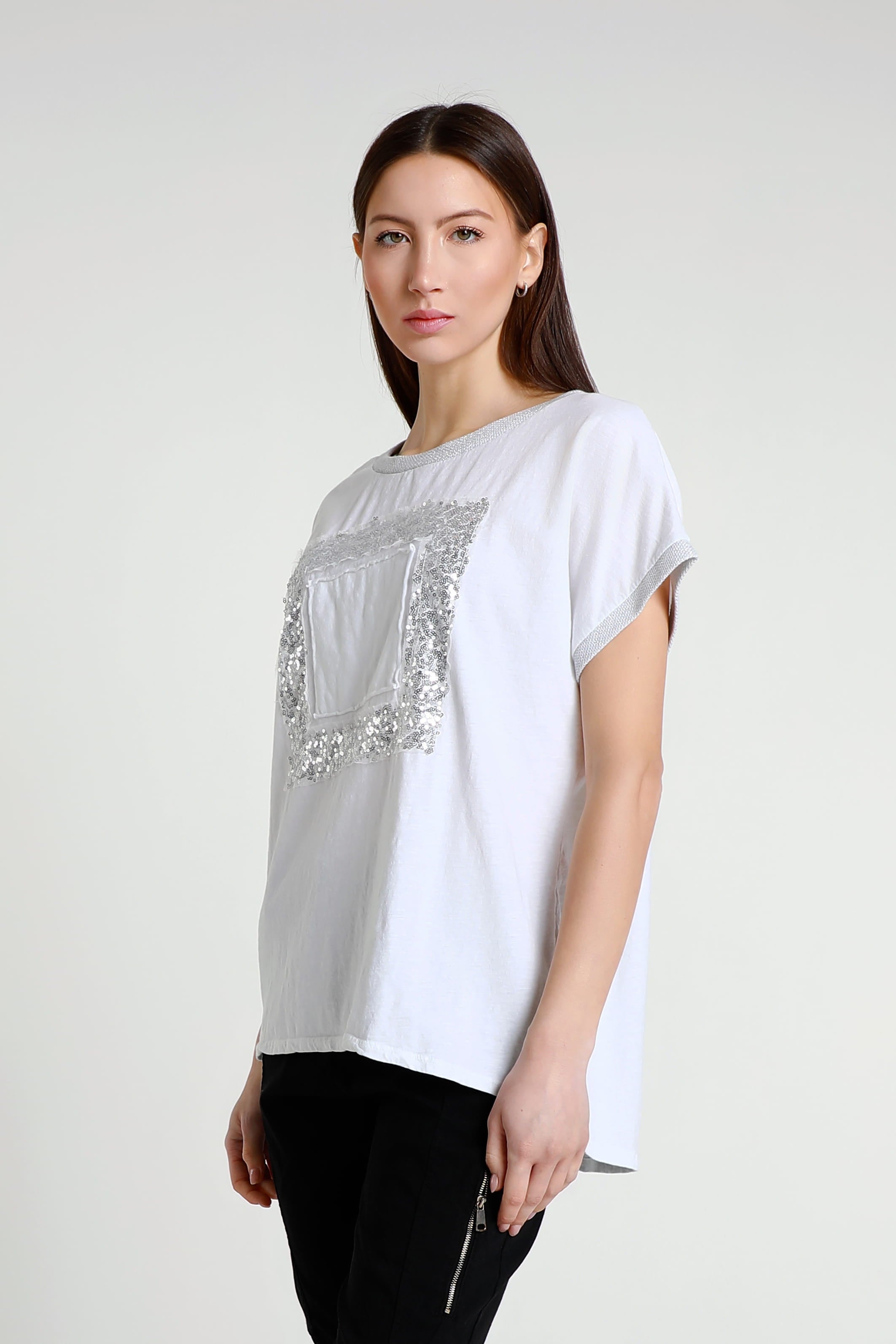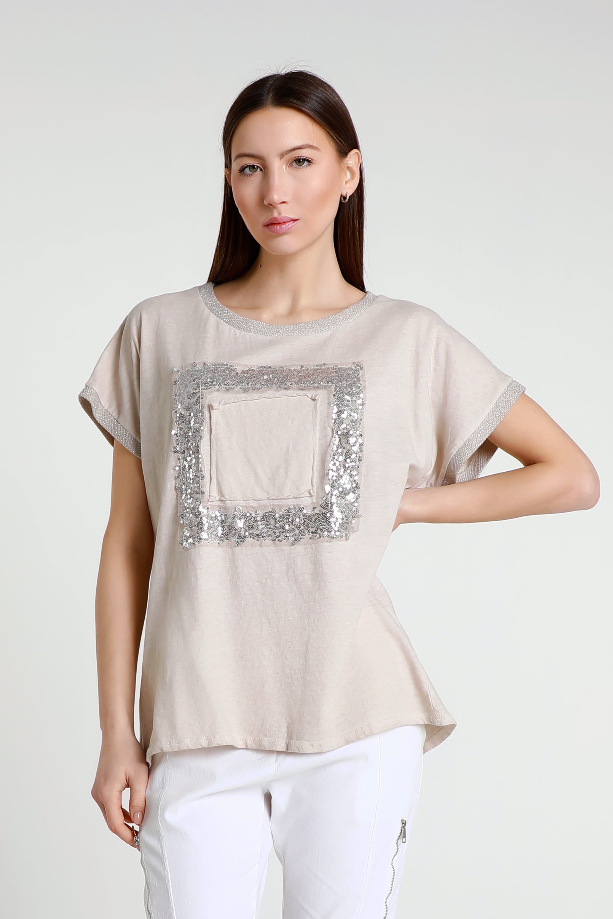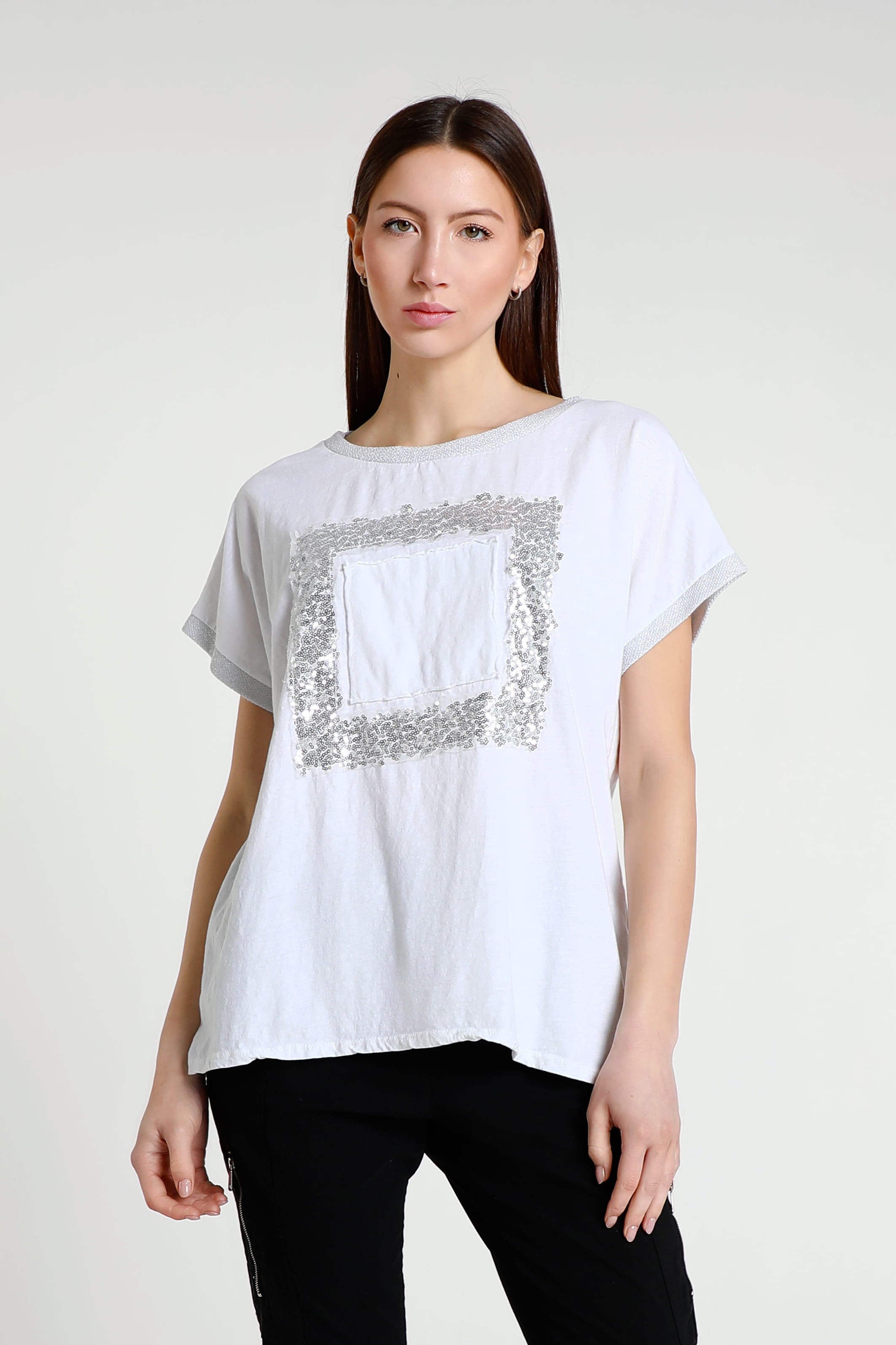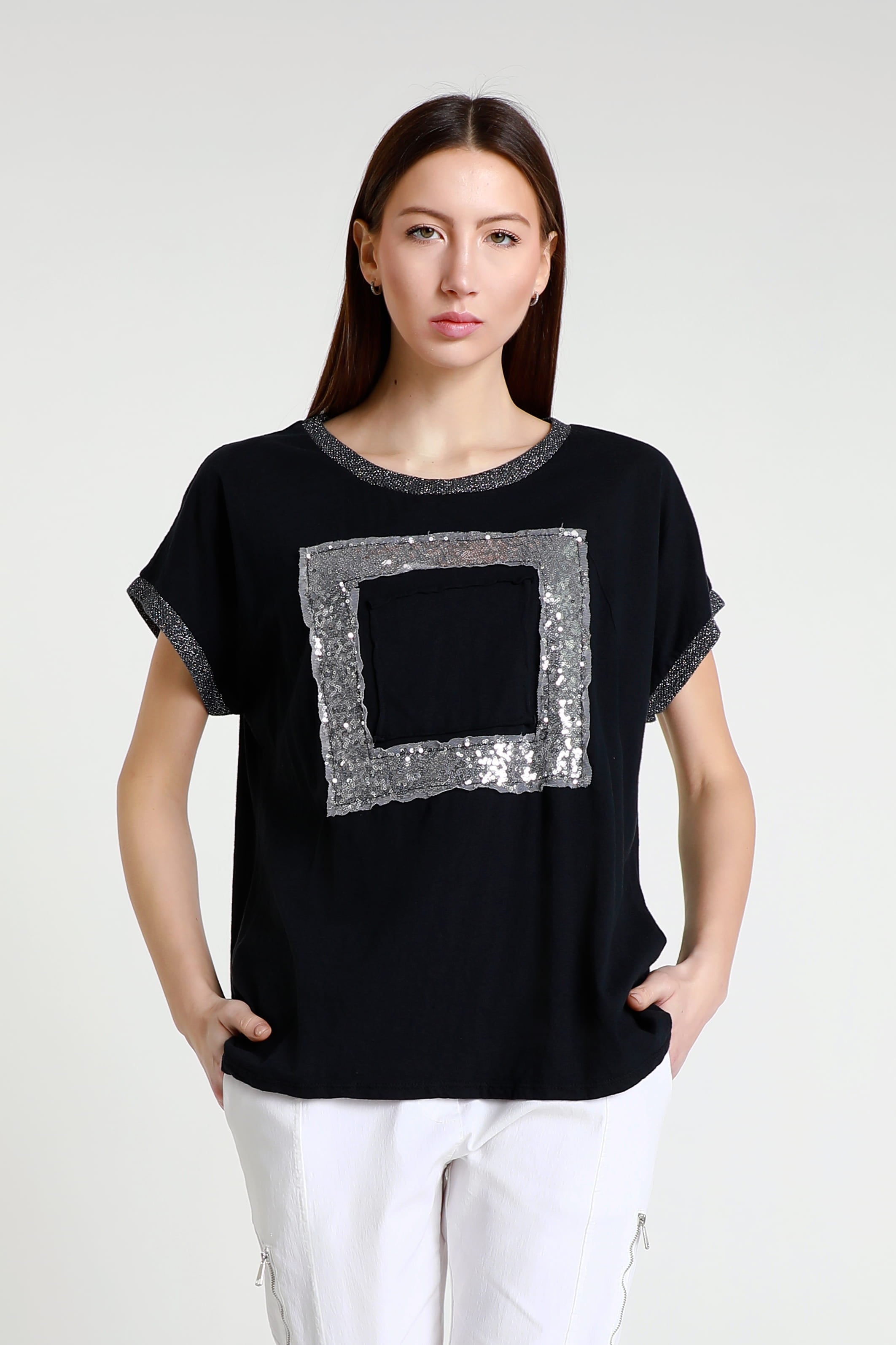 Vanya is a gorgeous standout tee with a little bit of everything! Her metallic collar and sleeves perfectly complement her shimmering square. Not only does her design give you a little bit of flair, but her 100% cotton composition feels like a cloud. She is the perfect simple statement piece, easily paired with any pant, jean or shorts. Made in Italy.
