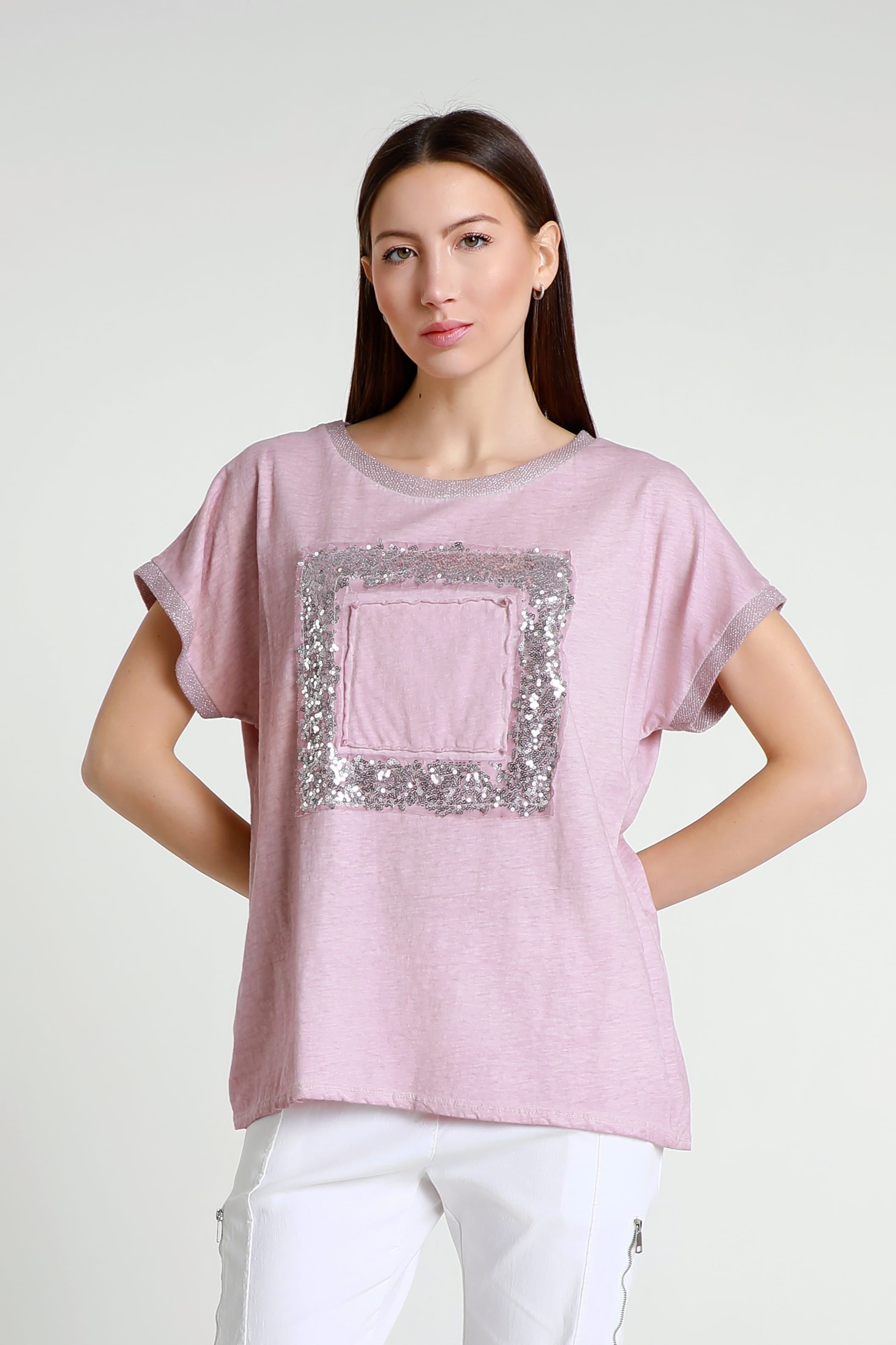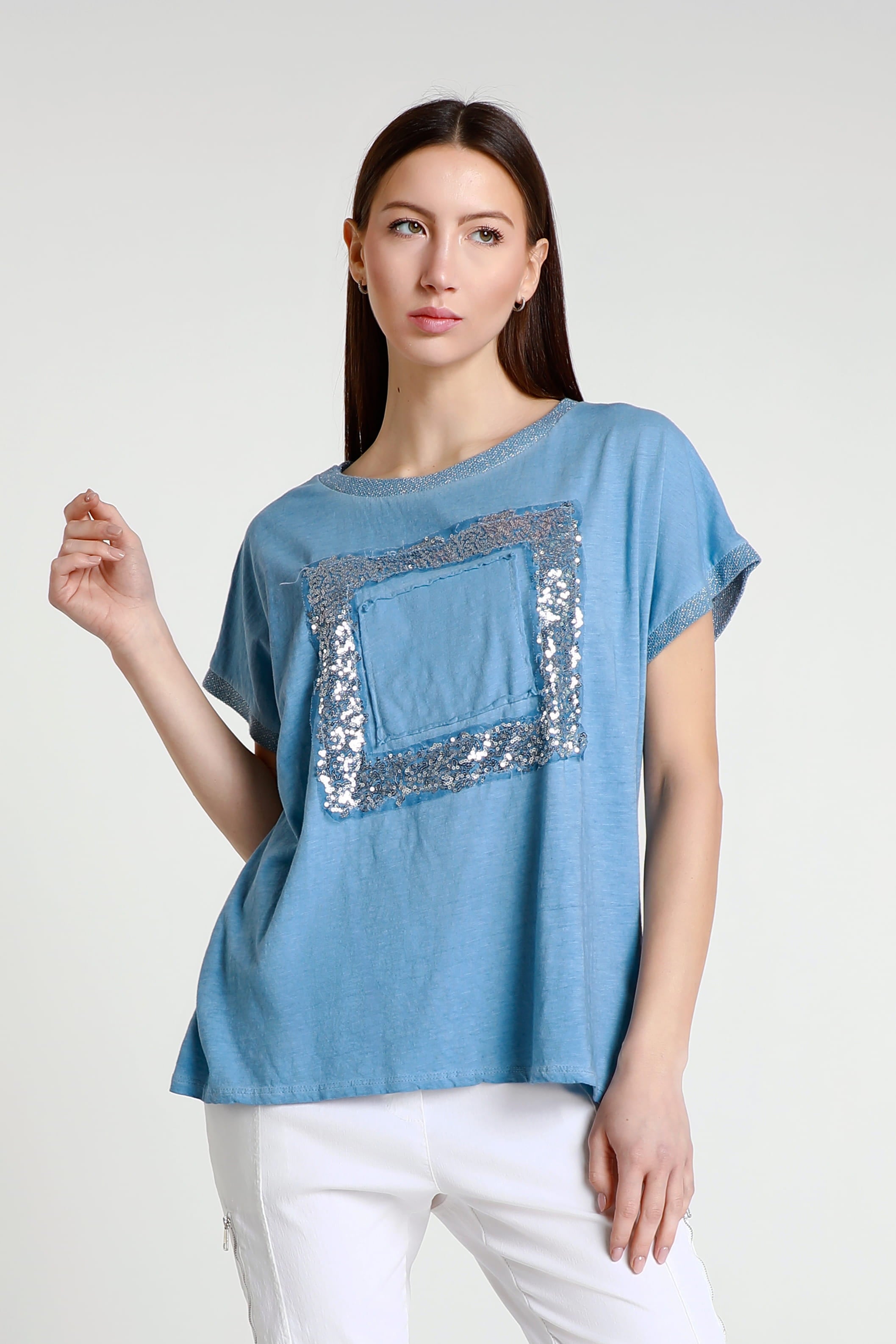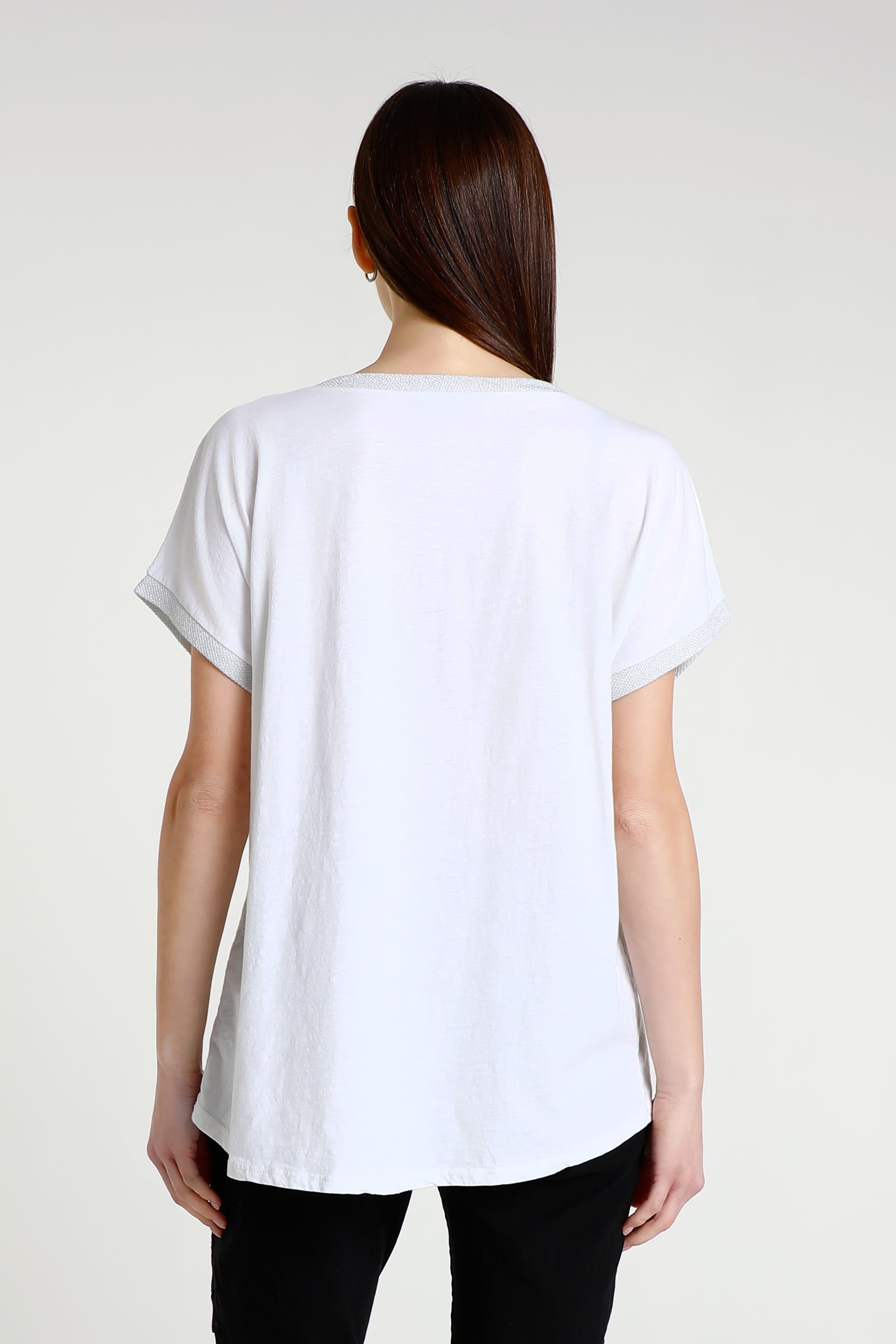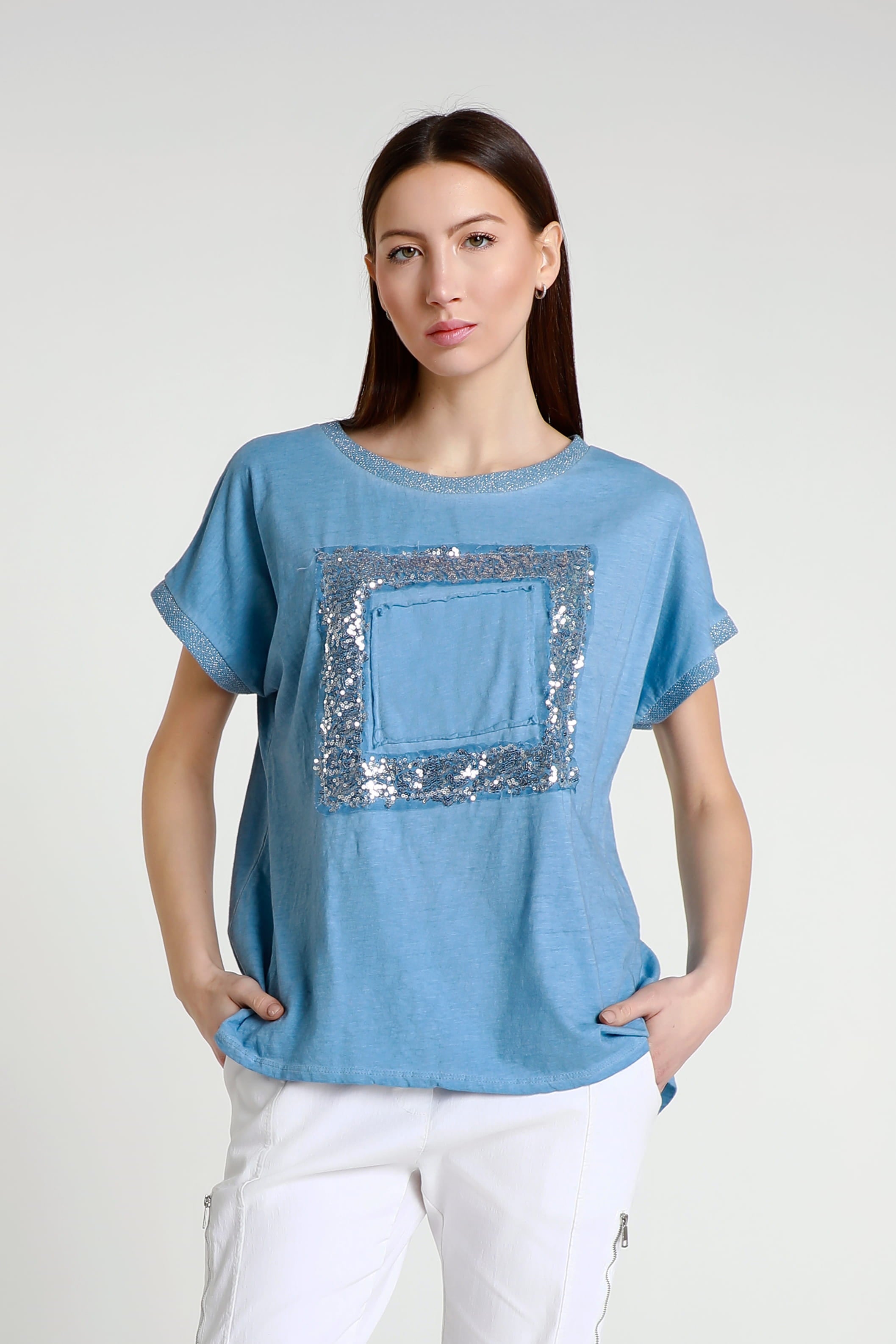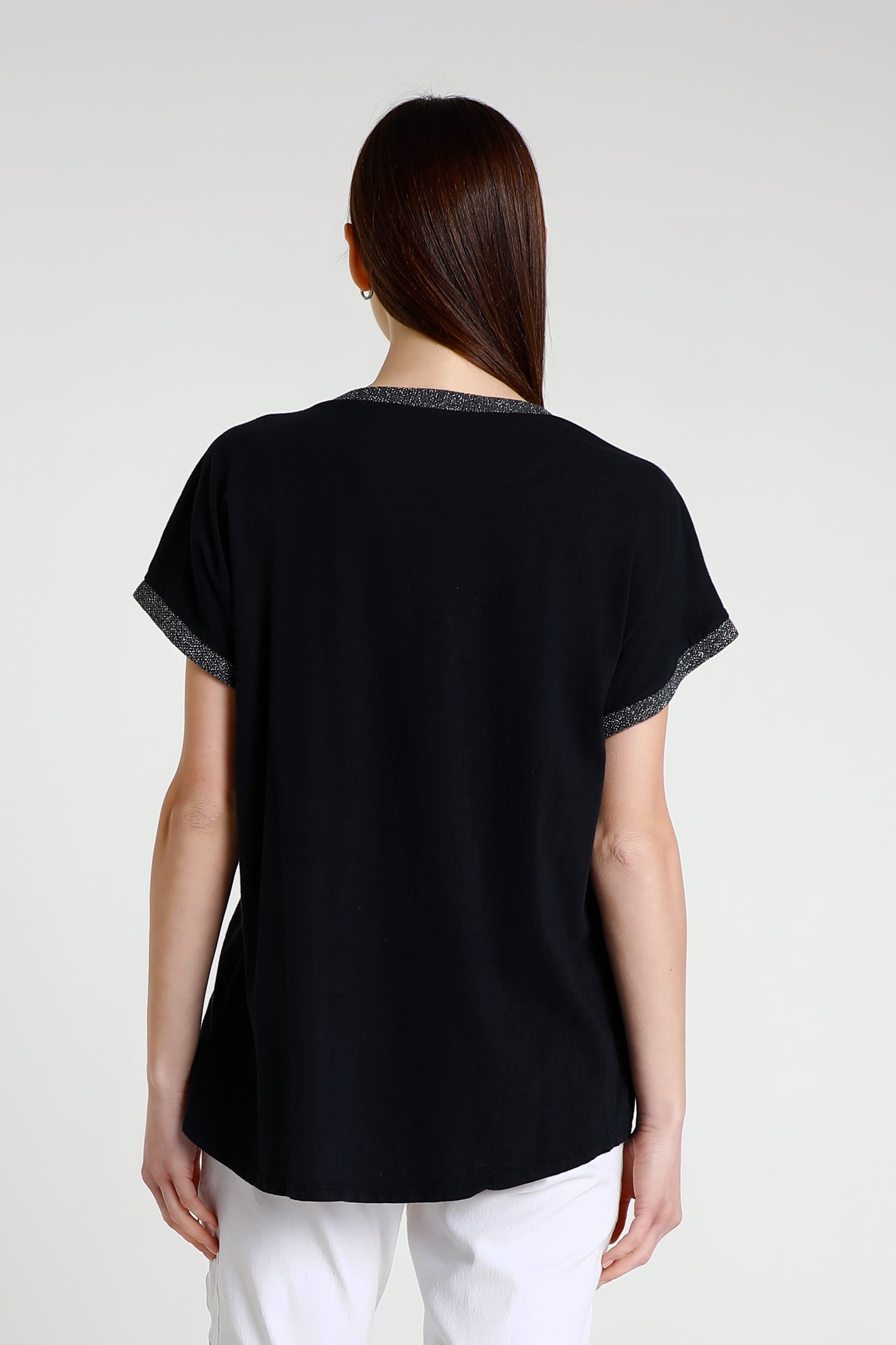 Vanya is a gorgeous standout tee with a little bit of everything! Her metallic collar and sleeves perfectly complement her shimmering square. Not only does her design give you a little bit of flair, but her 100% cotton composition feels like a cloud. She is the perfect simple statement piece, easily paired with any pant, jean or shorts. Made in Italy.